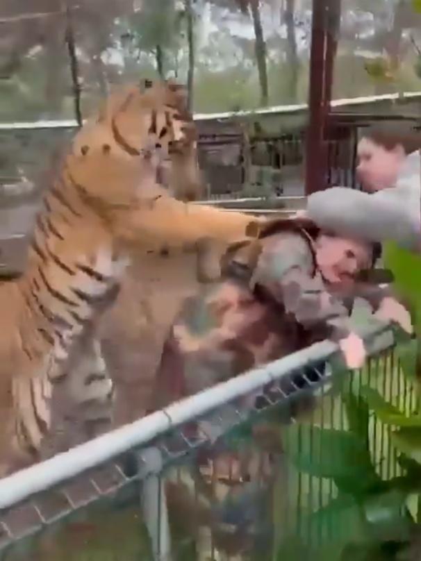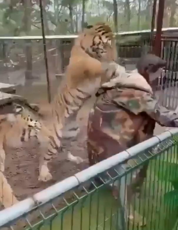 別背向猛獸,女獸醫被老虎從後偷襲,狂爪欲強拖入籠。(X)