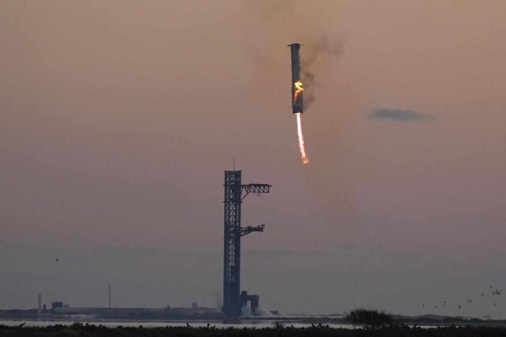 SpaceX的星艦火箭助推器日前成功在發射台回收一幕,猶如筷子插回筷子筒般。(美聯社)
