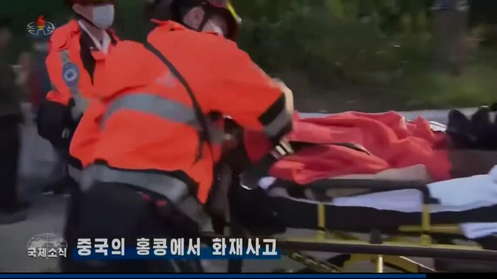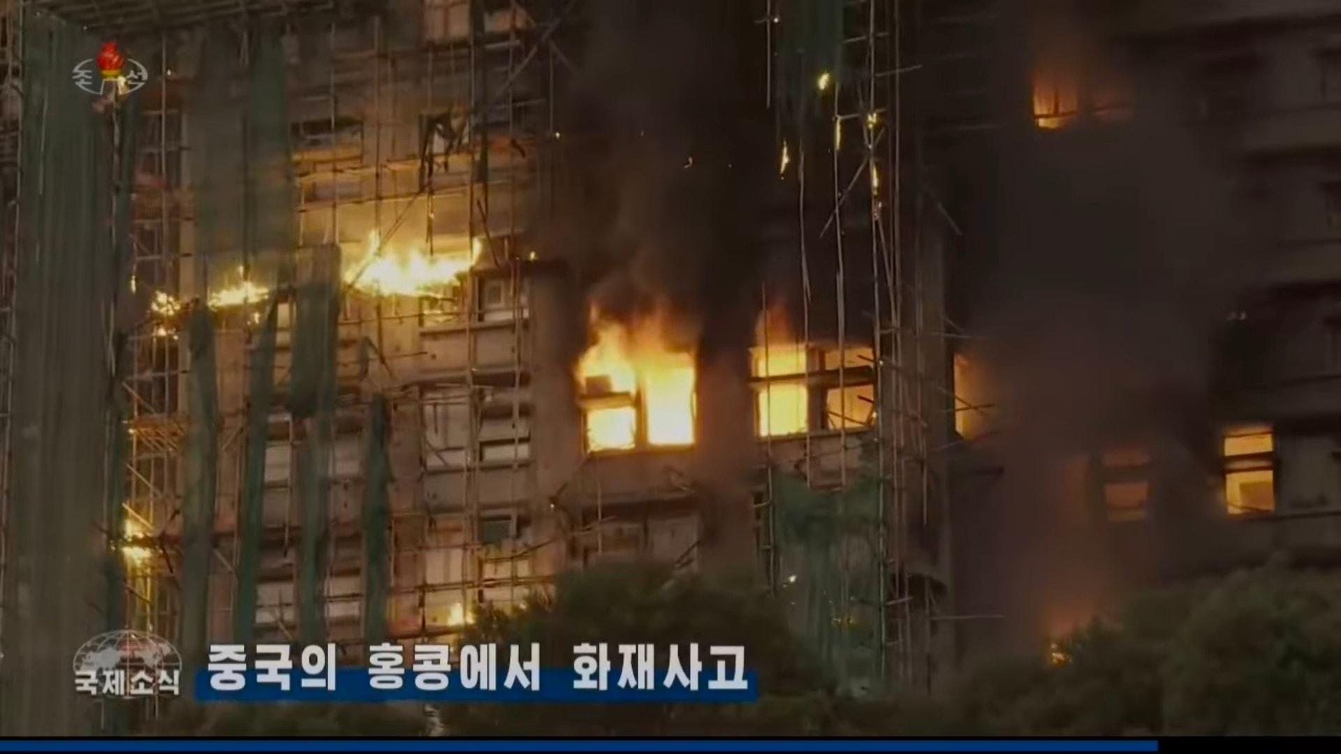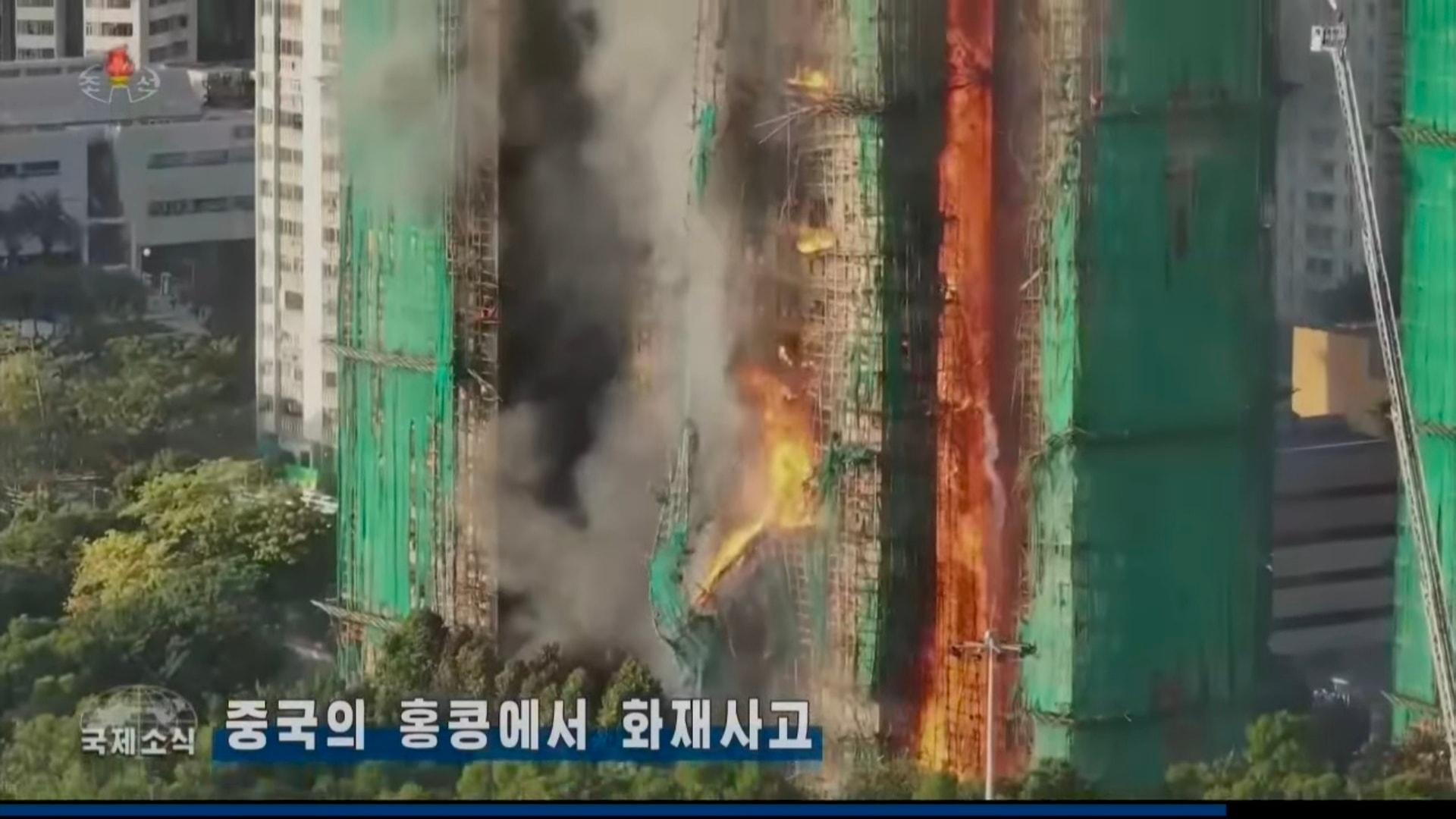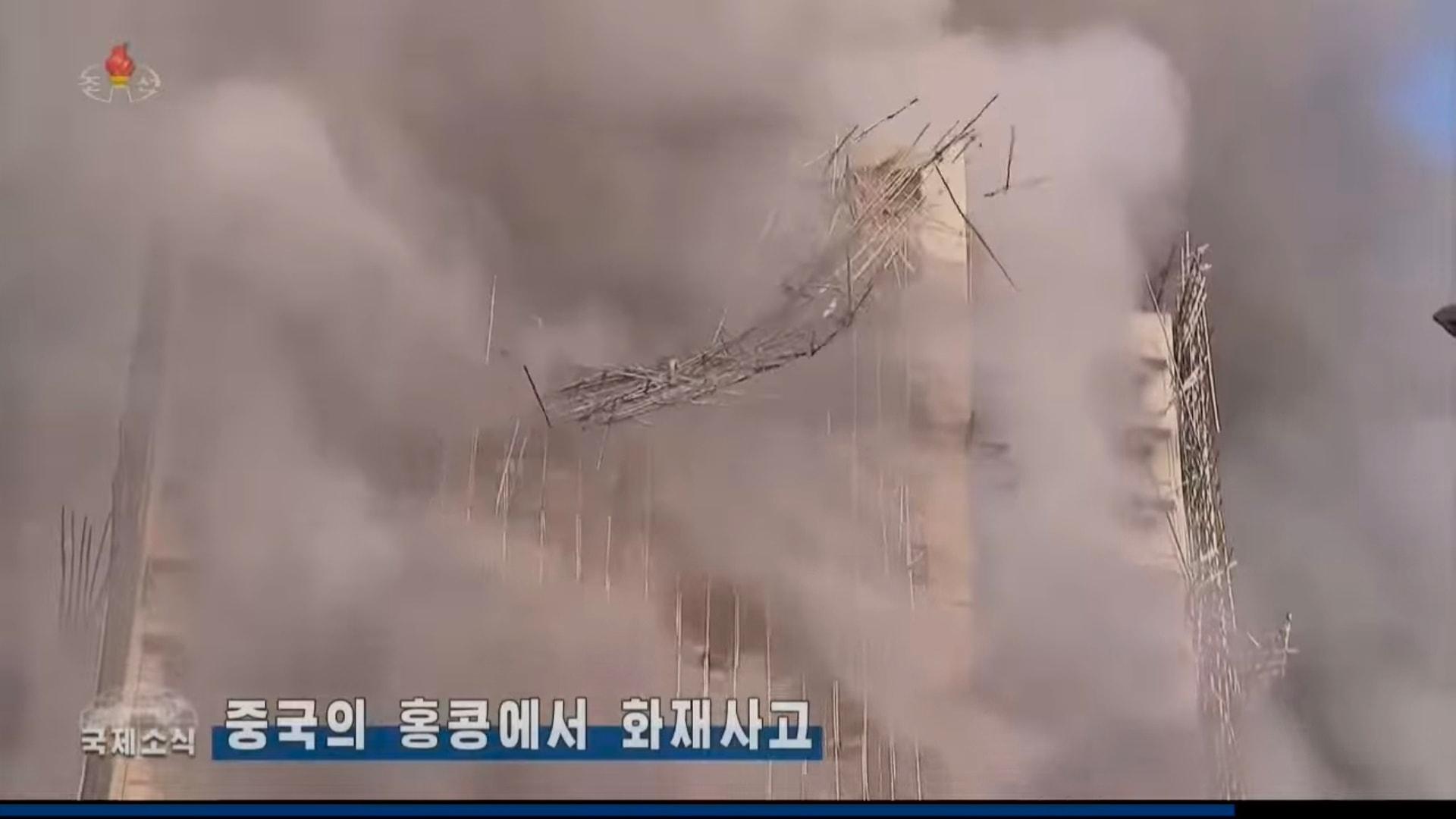 大埔宏福苑五級大火震驚全球,,北韓中央電視台晚間新聞節目亦有於國際新聞環節報道事件,畫面可見宏福苑多座樓宇大火,消防救護進行救災的情況。(facebook專頁「我帶你們看朝鮮」)