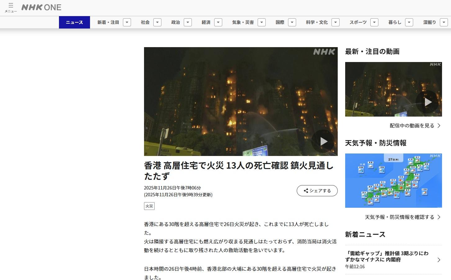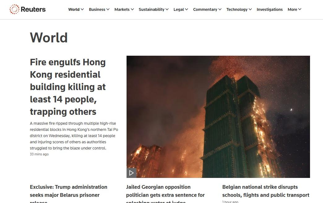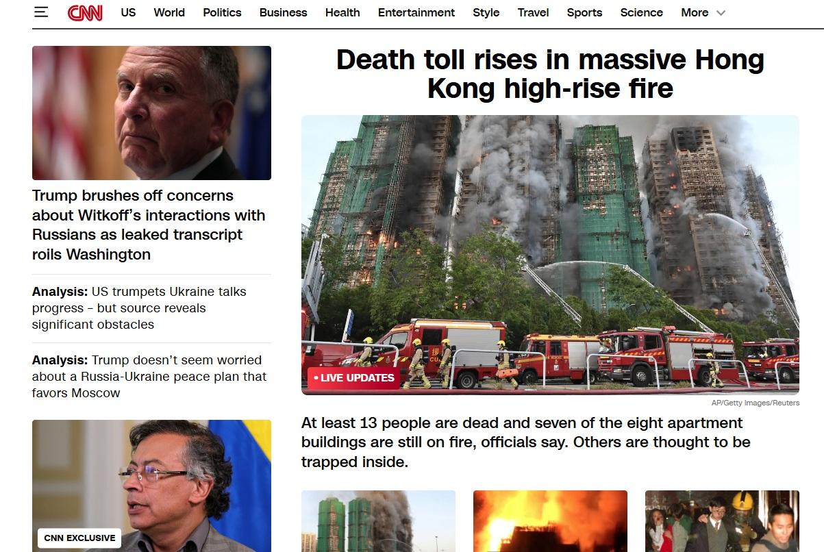 大埔宏福苑五級大火,災情嚴重,多個國際媒體均以顯著篇幅報道,關注最新發展。美國有線電視新聞網(CNN)、英國廣播公司(BBC)、日本放送協會(NHK)等新聞網站都在首頁作相關報道。其中,CNN以「香港高層屋苑大型火災,死亡人數上升」為報道標題,附有圖輯、影片、救援情況等報道。
