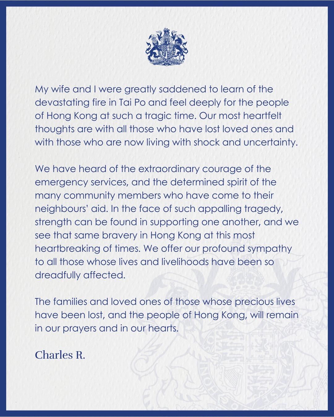大埔宏福苑五級火造成嚴重傷亡。英王查理斯三世發文表示,他與王后卡米拉得知火災後深感悲痛,他們與所有失去摯親,活於惶恐和不安的人同在。