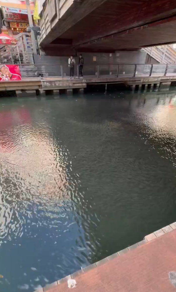 大阪道頓堀川18日出現奇景,水裡出現密密麻麻的魚群。(互聯網)