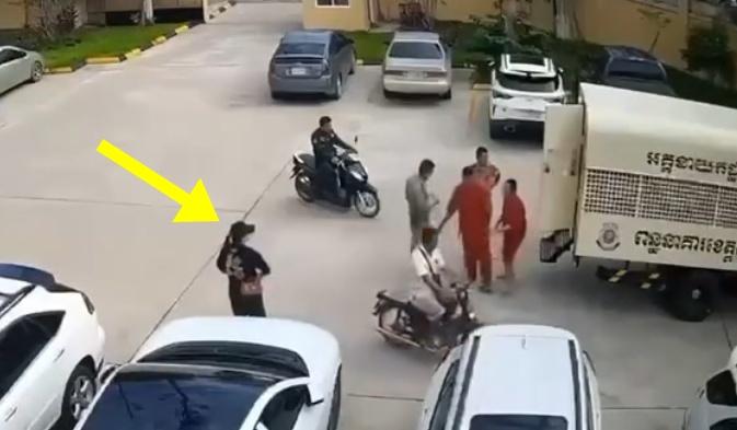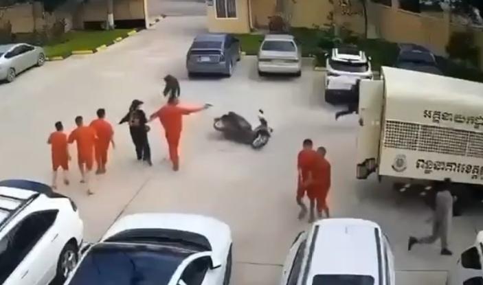 柬埔寨柴楨省初級法院外發生一宗誇張的持槍劫犯事件。監控顯示,一名女子進入法院等候囚車,一名囚犯下車後解開了另一名囚犯的手銬,女子掏槍遞給該囚犯。該囚犯立即向警員開槍,牽著女子,同另外5名囚犯直奔大門,逃之夭夭。