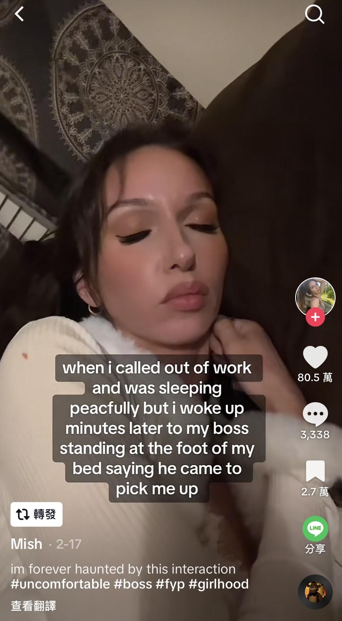 女事主Mish表示,「當日我請假在家中睡覺休息,但不久我醒來時,老闆就站在我床尾,說他來接我上班」,短片旋即引來670萬次瀏覽,不少網民留言抱不平︰「若你無邀請他來你家,那根本就是犯罪。他無權進入你睡房」、「換著是我,我一定會告他」。