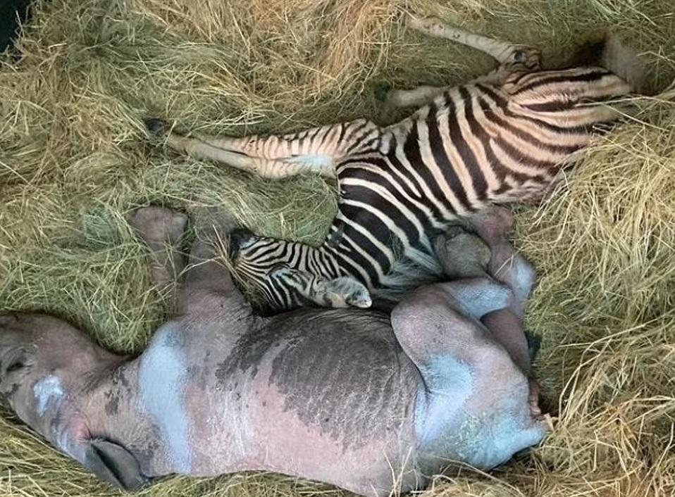 7個月大的犀牛「Daisy」與比牠大一個月的斑馬「Modjadji」,在野生動物庇護中心接受治療期間形影不離,從中心在Instagram發布的影片可見,牠們一同喝奶、散步,睡覺時依偎在一起,Daisy會像狗一樣,舔舔Modjadji背部,十分親暱。