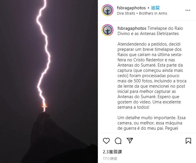 攝影師Fernando Braga成功捕捉到這難見的奇景,有網友留言指基督像對上兩次被「雷劈」是2008年和2014年,另有人笑稱「這是耶穌基督,還是雷神?」 也有人指出,基督像那麼高被雷電擊中應常發生,問題是有沒有拍攝到吧了。有網民讚攝影師技藝高超,並多謝他分享照片。幸好今次閃電並未造成基督像損毀,2014年那次拇指被擘毀需修補。救世基督像2007年被稱為「新世界七大奇景之一」,豎立在山頂上逾2,000呎高。