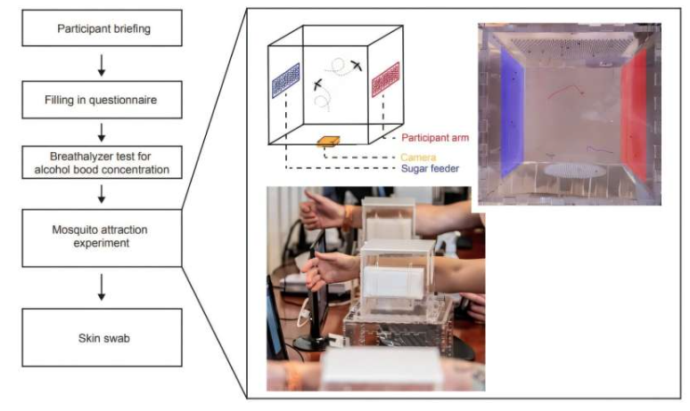 研究團隊在音樂節現場搭建了一個由貨櫃改裝的臨時實驗室,邀請了500名志願者參與。每位志願者首先填寫了一份關於個人生活習慣的問卷,包括飲食、衛生和社交行為等。他們之後把手臂伸入一個特製蚊籠中,籠內裝有數千隻雌性瘧蚊(Anopheles)。這種特製籠子設有小孔,讓蚊子能嗅聞人體氣味卻無法叮咬,研究人員透過攝影機記錄蚊子停駐在手臂與糖餌上的比例差異。