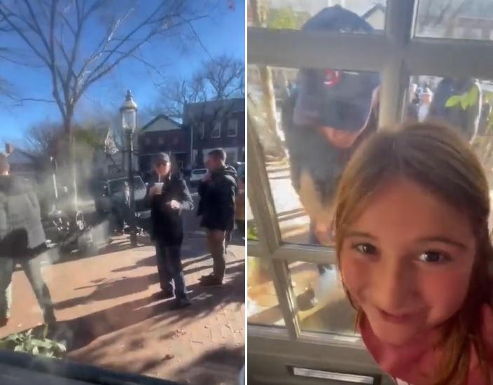 拜登聽到小孩在店裡歡呼尖叫,便走到窗前,蹲下身與女孩自拍。(互聯網)