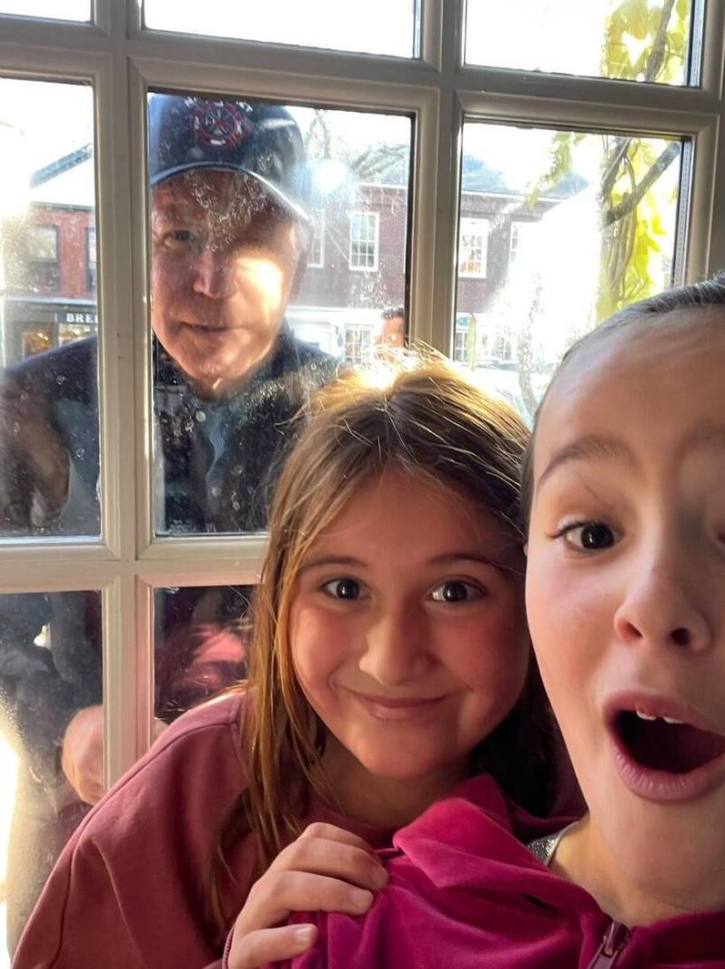 美國總統拜登上周末與家人到麻省南塔克特島(Nantucket)歡度感恩節假期,逛街期間看見一群孩子在食店隔著玻璃窗熱情歡呼,他便親切地蹲在窗前與孩子們自拍,未料竟拍出一張奇怪的照片……