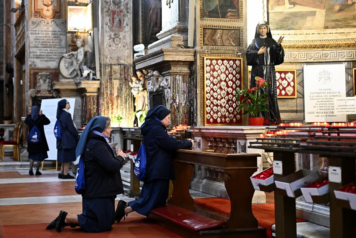 教徒在聖伯多祿廣場為教宗祈禱。(路透社) 修女在梵蒂岡內禱告。(路透社)