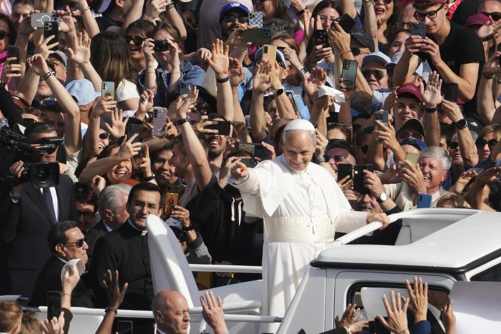 69歲的教宗乘坐專用的開篷座駕,在聖伯多祿廣場繞行,他站在開篷車的後座,向廣場上的信眾揮手。由於教宗除擁有美籍外,亦擁有秘魯國籍,故現場除可見美國及梵蒂岡國旗外,也可見不少秘魯國旗,民眾也紛為教宗歡呼。