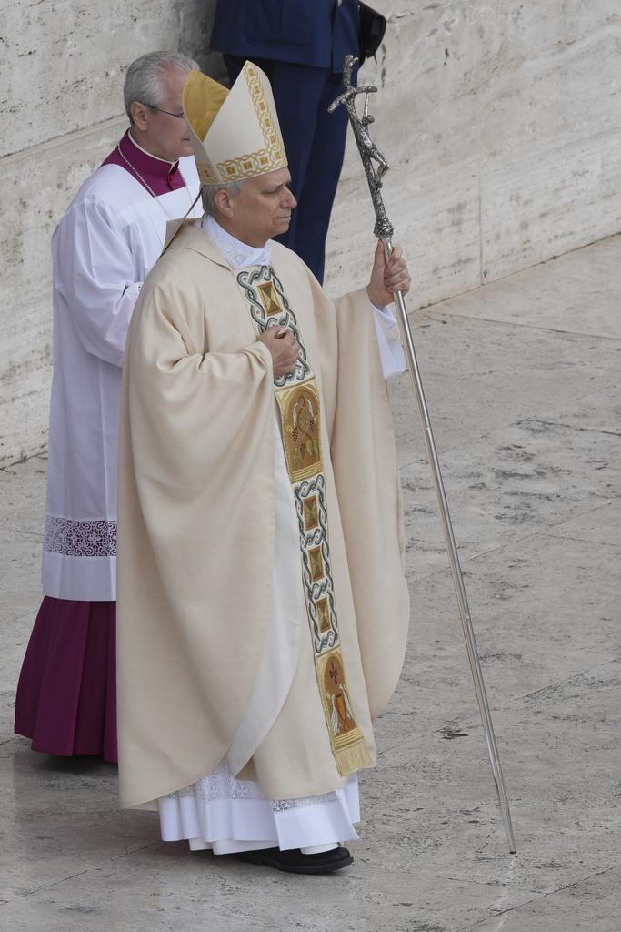 教宗之後在聖伯多祿大教堂的主祭壇上祈禱,然後再前往聖伯多祿廣場出席彌撒,並接下象徵教宗權力的羊毛披肩及漁人戒指。他期間一度哽咽。教宗在講道中表示,希望以愛與團結為信徒服務,令天主教會成為世界和平的力量;指在現今時代仍可見太多不和諧、由仇恨、暴力、偏見等造成的恐懼,以及剝削地球資源和邊緣化最貧困人口的經濟模式帶來的傷害。