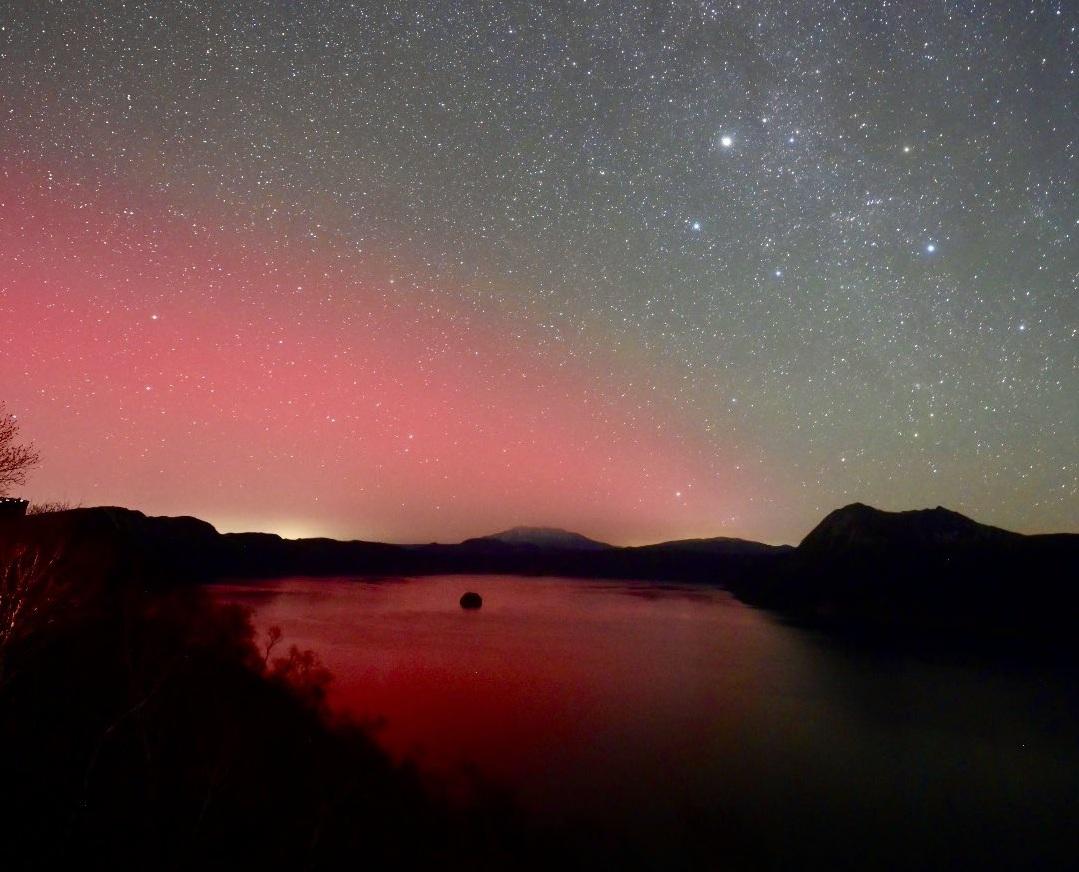 日本媒體報道,在周三晚上7時起在北海道多處都見到「低緯度極光」,這些光最初會是粉紅色,然後逐漸變紅,顏色亦會在變化。由於日本昨日天氣晴朗,可清晰看到天空的星象。在北海道的阿寒湖更因為滿天的星光連同極光,在湖面反射成為美景,甚至出現了流星。在釧路以及十勝亦有看到極光的景象。
