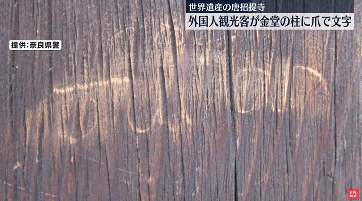 7日下午1點半左右,唐招提寺的工作人員向警方報案表示「有外國遊客在柱子上用指甲刻字」。