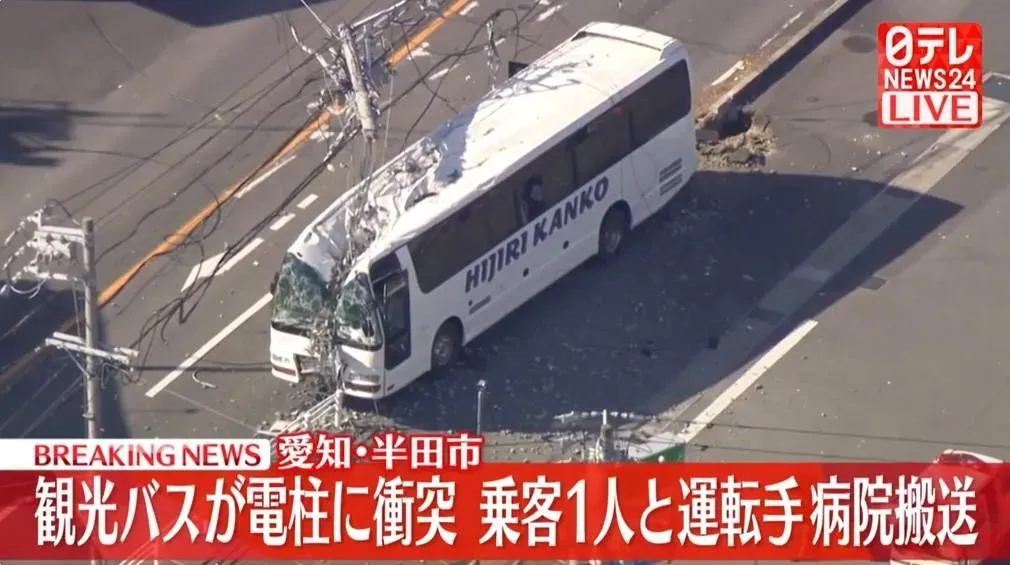日本愛知縣8日上午,驚傳觀光巴士衝撞電線桿的車禍,只見車頭當場被電線桿劈成兩半,當時車上還載有30名乘客。