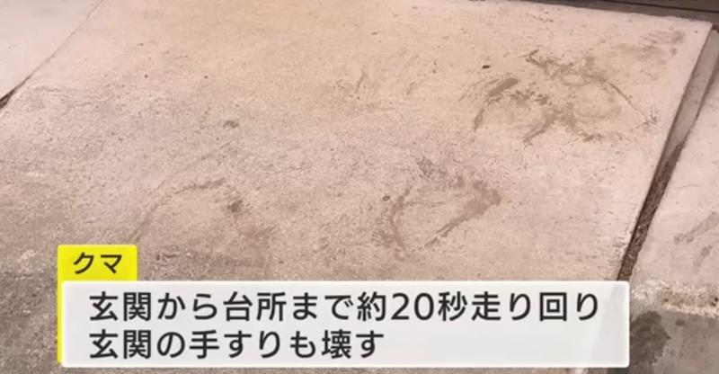 綜合報道,事發於10月31日上午,一隻身長逾1米的野熊在岩手縣雫石町,撞破一戶民宅的拉門並闖入。女戶主描述,野熊從玄關到廚房的走廊跑來跑去大約20秒,還破壞前門的扶手,她與丈夫當時都在屋內。就在此時,他們飼養的5歲哥基犬「Riku」開始吠叫,絲毫不畏懼比牠體形更巨大的黑熊,黑熊被嚇得轉身逃離,熊的掌印仍可在住宅外的地上清楚地看出。