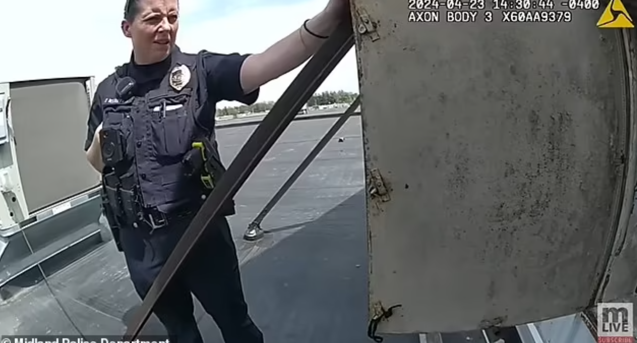 事件於本月較早時已獲報道,日前則有警員隨身鏡頭片段曝光。該「招牌屋」位於密歇根州密德蘭(Midland)的Family Fare超市屋頂。據報當日該名34歲女子從招牌屋步出時,穿著一套全黑服裝,包括滑雪面具、一套Puma運動服、Adidas運動褲,以及手套和滑雪護目鏡等。據警方稱,她聲稱這樣穿是因為對陽光敏感。