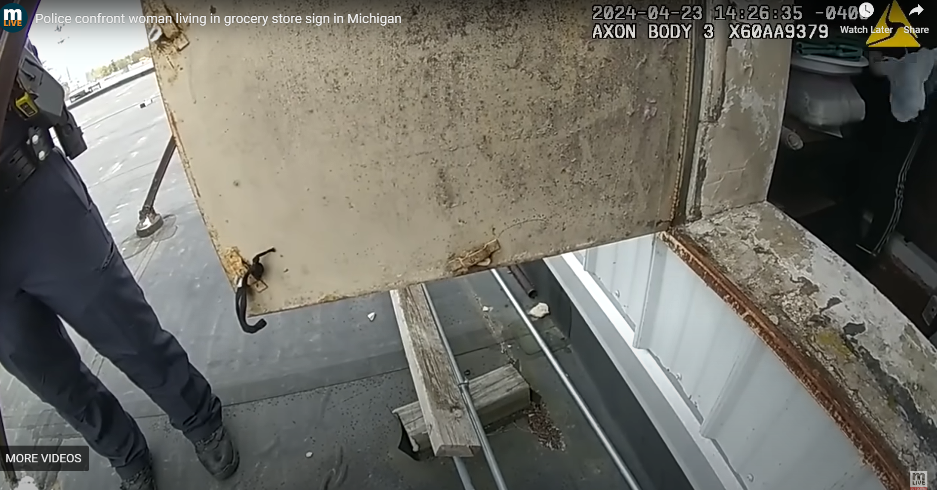 美國密歇根州早前發生一宗匪夷所思的事件,一名女子被發現蝸居在超市屋頂的招牌裡長達一年,裡面有簡單家具,甚至有咖啡機。當日上門驅趕的警員隨身片段日前首度曝光,揭示該「招牌屋」樣子的大門,並有更多細節,包括原來當日揭發事件的裝修工人,以為招牌內藏有一具屍體,嚇得魂飛魄散,定過神來才知是活人。