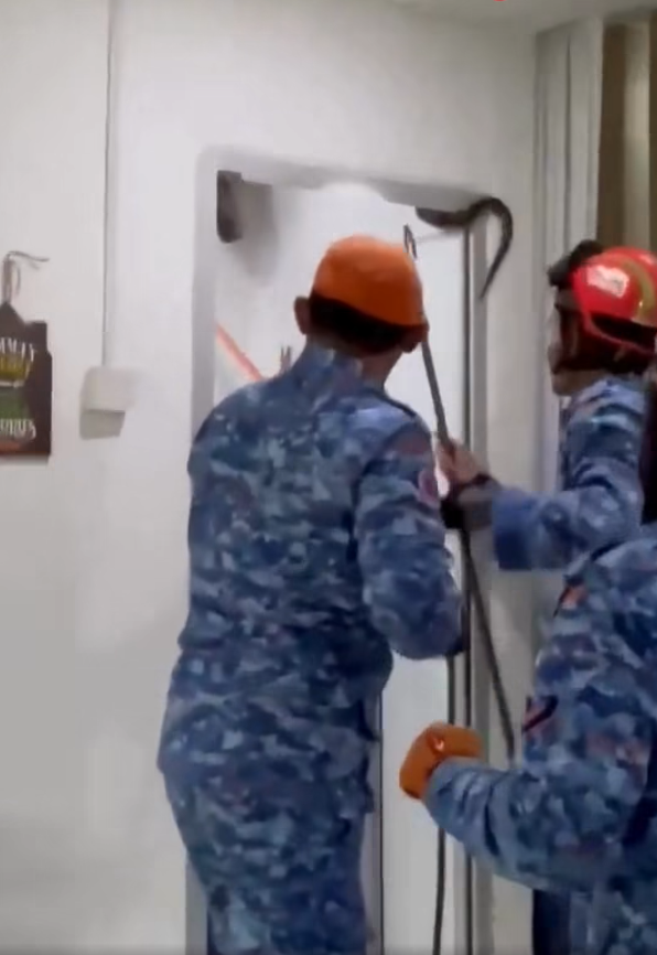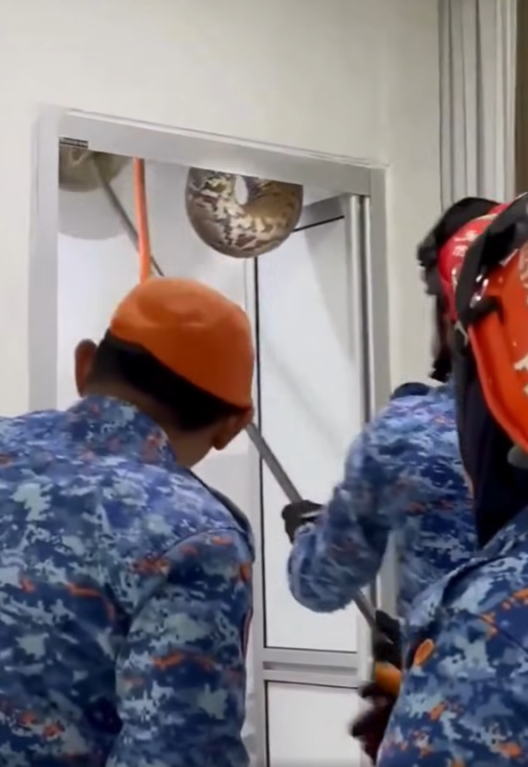 事件發生在11月12日,當地民防部隊人員接報抵達上述居所後,先以長桿輕敲天花板,以確認巨蟒的位置。經一輪敲打後,巨蟒粗壯的尾巴衝破天花板跌落,民防部隊人員嚇至向後退,之後再上前合力捕捉巨蟒。經一輪努力後,終於將巨蟒扯落地面,成功捕捉牠。女戶主表示,蛇跌下後,才驚覺牠十分巨大,並十分慶幸及早發現,否則牠會走進屋裡。她推測這條巨蟒可能原本棲息在附近的沼澤,並利用院子裡的榴槤樹爬進屋內,並棲身天花板。她和兩名孩子受到十分大的驚嚇,每次使用浴室時都格外小心留意。