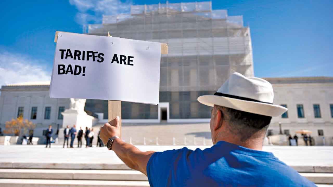示威者在最高法院外高舉「關稅是壞的」標語。(美聯社)