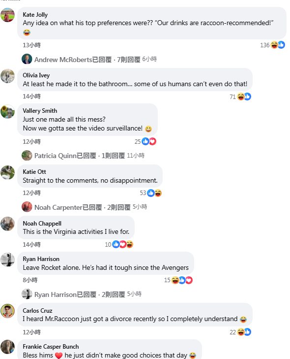 帖文稱,在上周六(29日)早上,動物保護中心接到一間店舖罕見的求助,職員抵達現場時發現「疑犯」闖入,並掃落數個貨架的酒,然後昏倒在廁所。經過數小時的睡覺疑犯浣熊已清醒,除了宿醉,並無受傷跡象,已安全地放回了大自然,希望牠吸取「教訓」。有網民笑稱,牠喜歡哪款酒,可成為「浣熊推介酒」。另有人不相信只有一隻浣熊便亂成這樣,要翻看閉路電視。也有網民搞笑說,「聽說浣熊先生最近離婚了,我完全理解。」