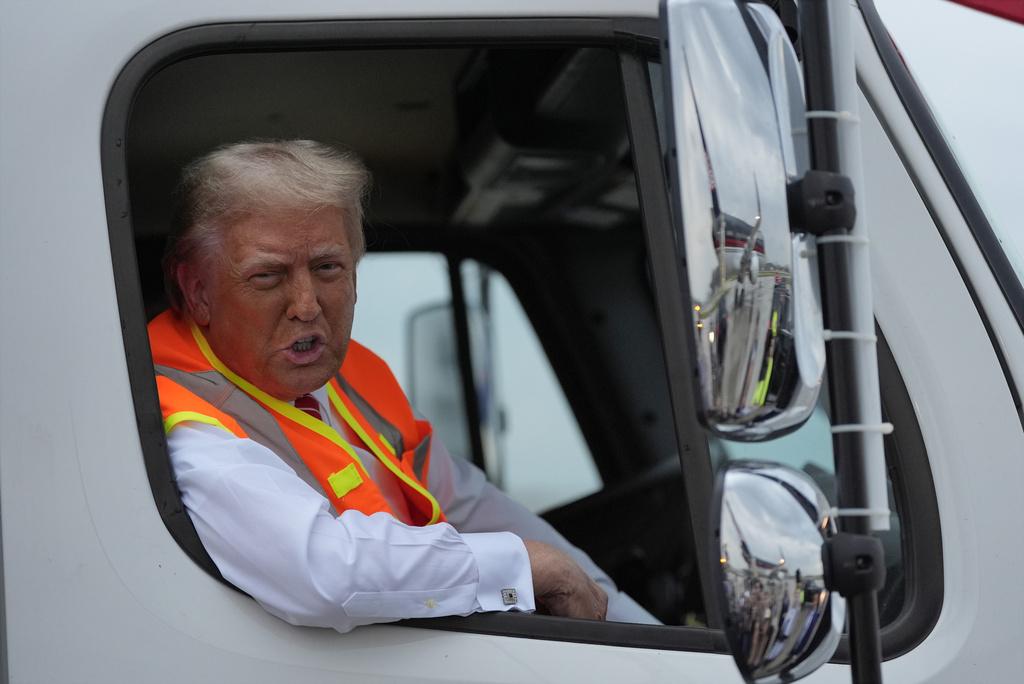 特朗普扮成工人登上垃圾車,挖苦拜登較早前的言論。(美聯社)