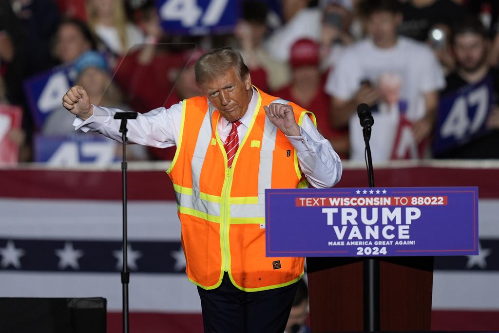 在拉票造勢方面,特朗普周三在今屆關鍵搖擺州、坐擁10張選舉人票的威斯康辛拉票。他落機時穿起橙色安全背心扮成工人,稍顯吃力地登上停機坪上印有他名字的垃圾車,表示「喜歡我的垃圾車嗎?是為賀錦麗和拜登而設」,指他們把國家和國民當成垃圾,做出包括開放邊境讓非法移民進入的等傷害國家的事。特朗普在之後的集會,亦穿著橙色背心出場。