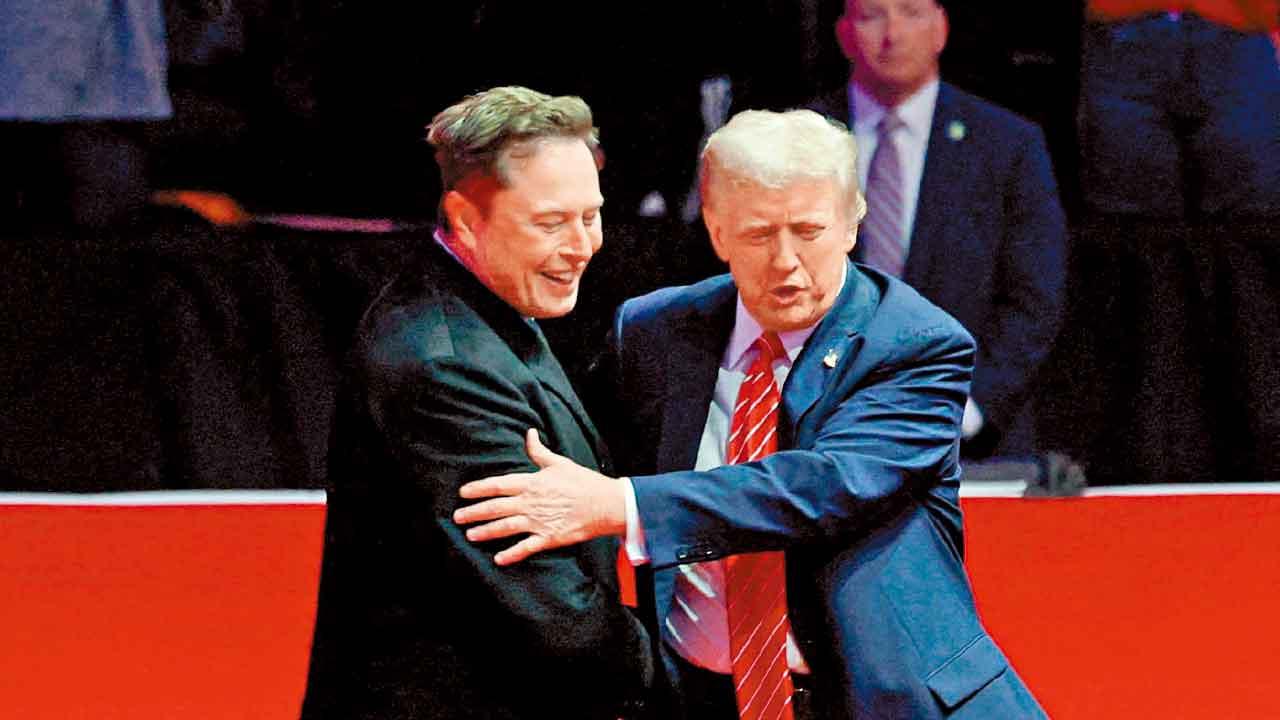 馬斯克(左)現身特朗普周日舉行的勝利集會。(路透社)