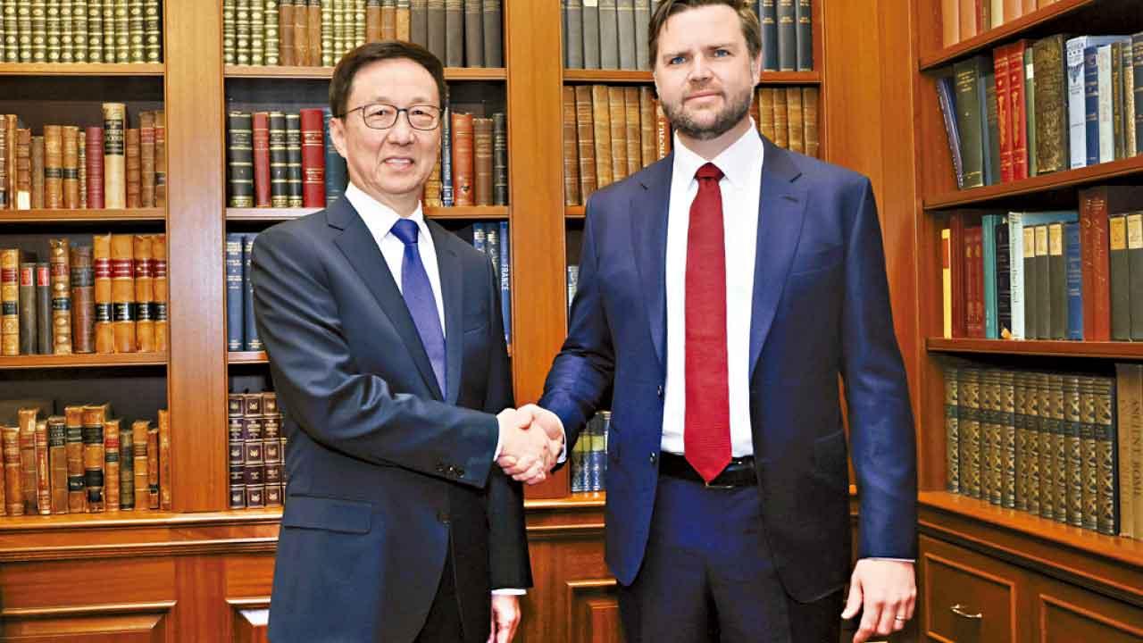 韓正周日與候任副總統萬斯會面。(美聯社)