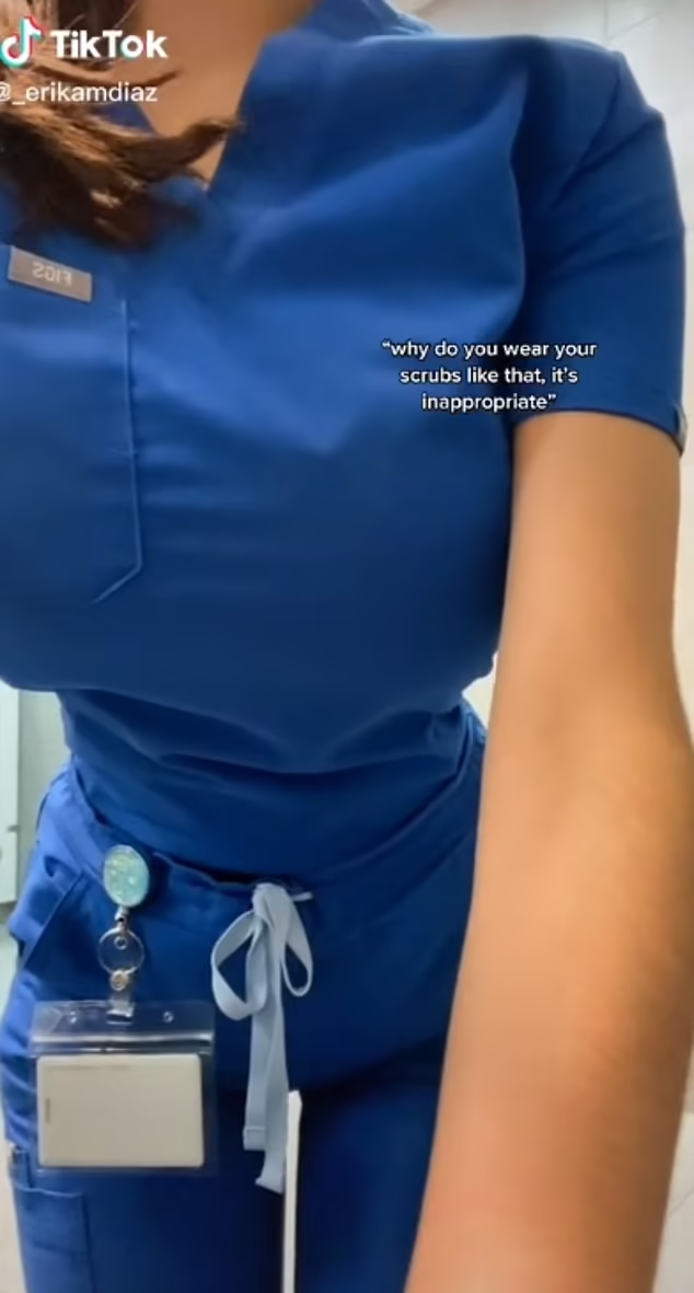 22歲女護士Erika Diaz早前在TikTok分享她穿起制服的「申冤短片」,埋怨有人問她「為甚麼你要把制服穿成這樣,這並不恰當」。她展示制服生產商的廣告,指廣告中亦可見制服本身就是貼身、收腰及束腳設計,並非她故意想穿到「爆衫」,「有些人是對我的身材有意見,而不是制服……我5呎2吋高、107磅,既矮又細小,你們喜歡的話可以說我身材造假,但這不是事實。」