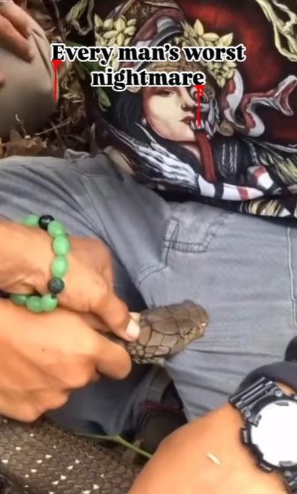 男子被蛇咬住褲襠左邊位置不放,被嘲是「男士最壞的噩夢」。(互聯網)