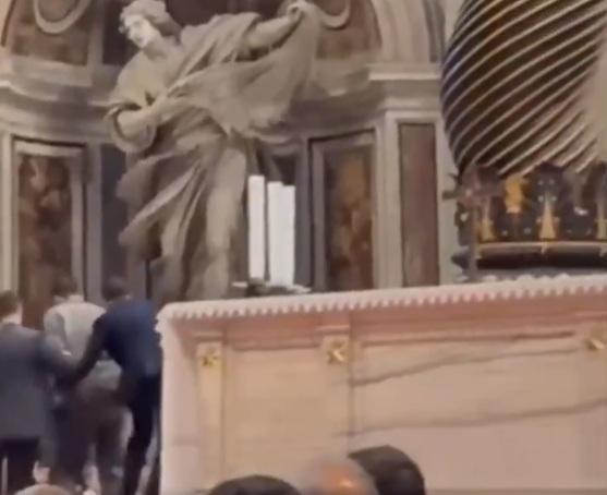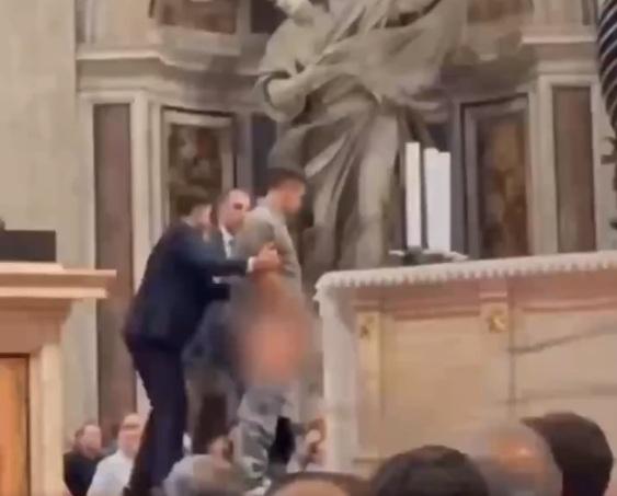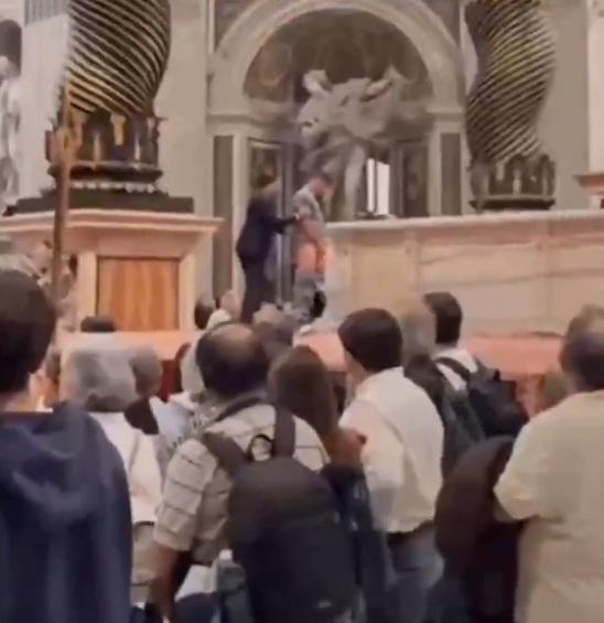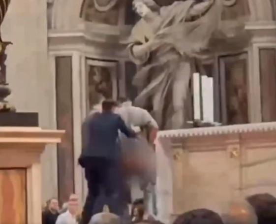 男子在梵蒂岡聖伯多祿大教堂聖壇旁邊突然脫褲小便,保安員上前阻止。(互聯網)