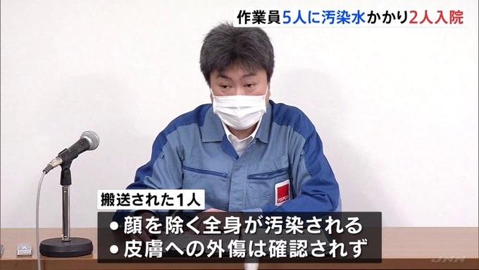 東電表示,兩名被污染的工人,其中20多歲的工人全身都被污染水污染,而40多歲的員工就下半身及兩手腕接觸到污水。二人在核電廠工地進行除染工序後,其身體表面的輻射標準仍然高於標準,因此在周三晚送院。目前再進行過除染工序,但仍需接受觀察。