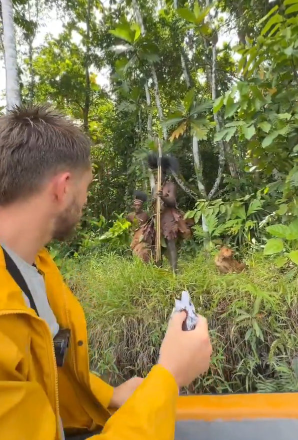 片段可見,Dara Tah與團隊乘坐小型木船接近部落時,立刻引起族人警戒。一名僅穿著樹葉裙、頭戴羽毛飾品的部落男子手持大型弓箭,直接對準他們的船隻。隨行的當地嚮導迪米試圖安撫雙方情緒,但情況顯然十分緊張。