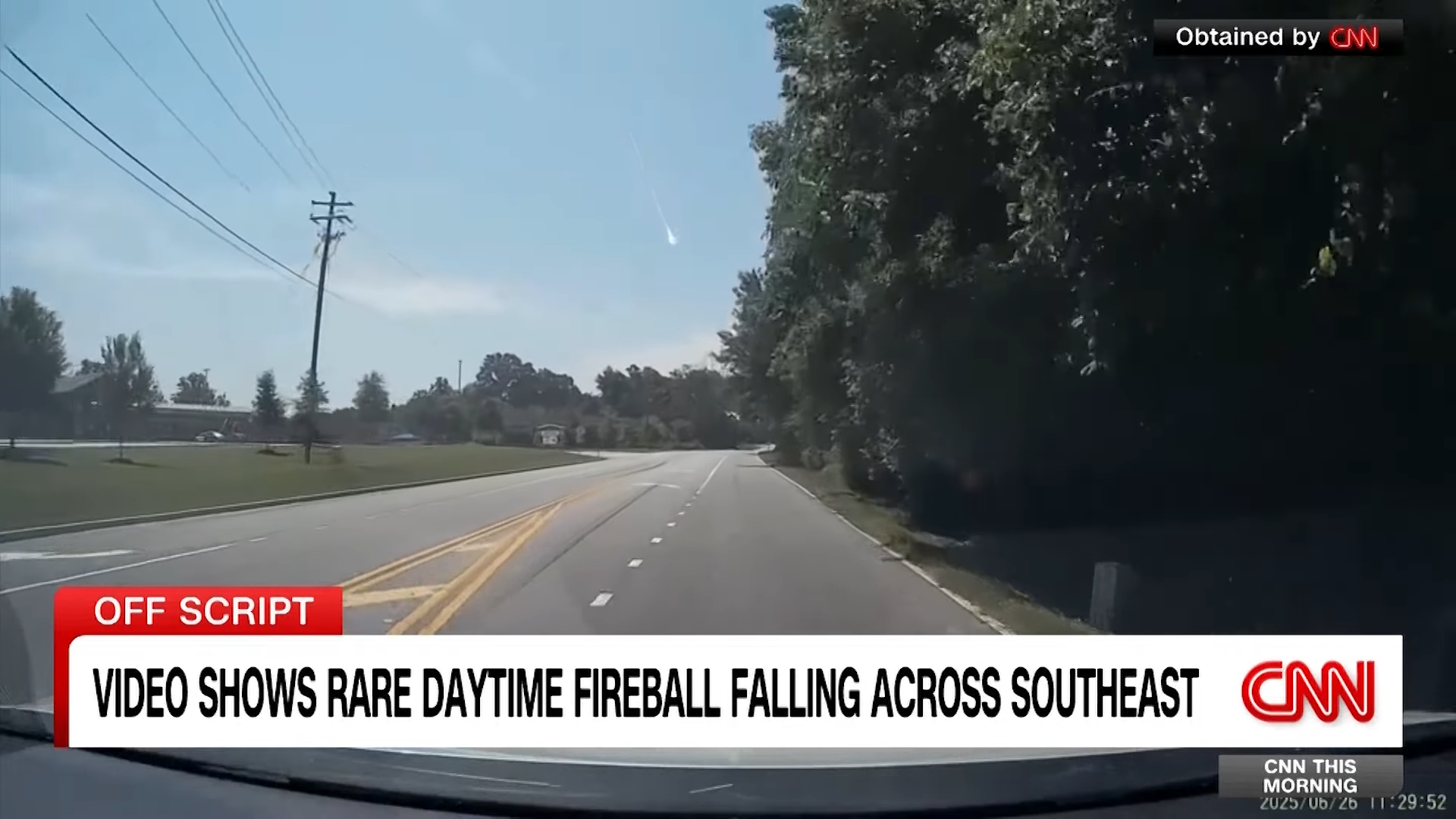 美國喬治亞州、田納西州與南卡羅來納州民眾,26日目擊一顆火球自天空墜落,伴隨強烈閃光與巨響,甚至造成地面震動,十分罕見。美國流星協會(AMS)初步研判,這是一起罕見的「白晝火球」現象,可能源自一顆隕石。