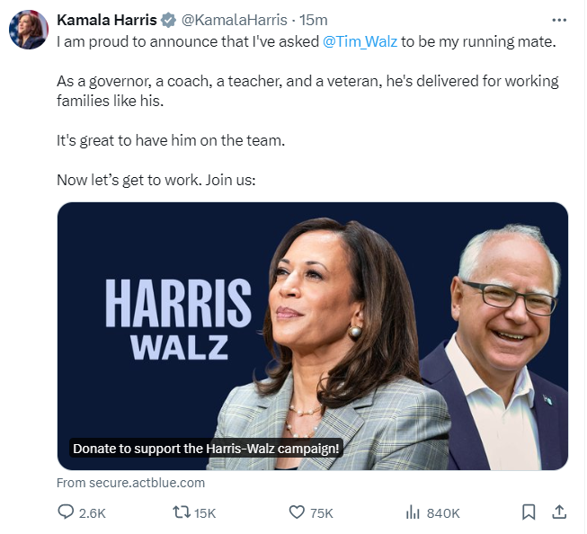 賀錦麗在社交平台公布副手人選。(互聯網)