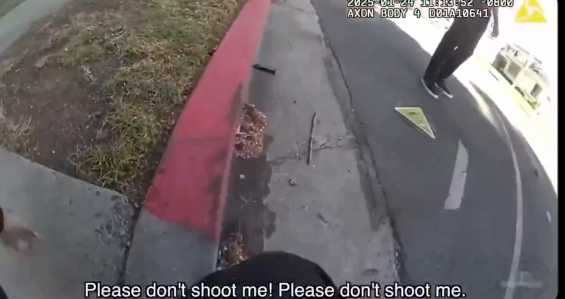 美國加州傳出一宗驚恐案件,一名26歲男子與警方對峙,並搶奪一名女警配槍,大批趕到的警力連開10槍制止,男子慘遭擊斃。警方15日公布事發當時畫面,被搶槍的女警驚恐不已,一度哀求男子「拜託,不要開槍」,十分驚險。