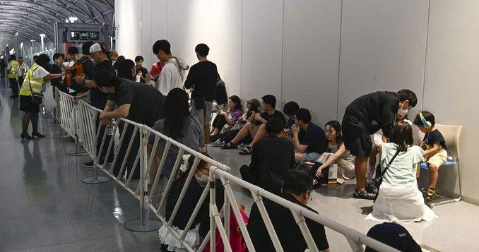 美國聯合航空客機在關西機場緊急迫降後,旅客在航廈內等候(12日晚間9點18分)( X/産経ニュース @Sankei_news)