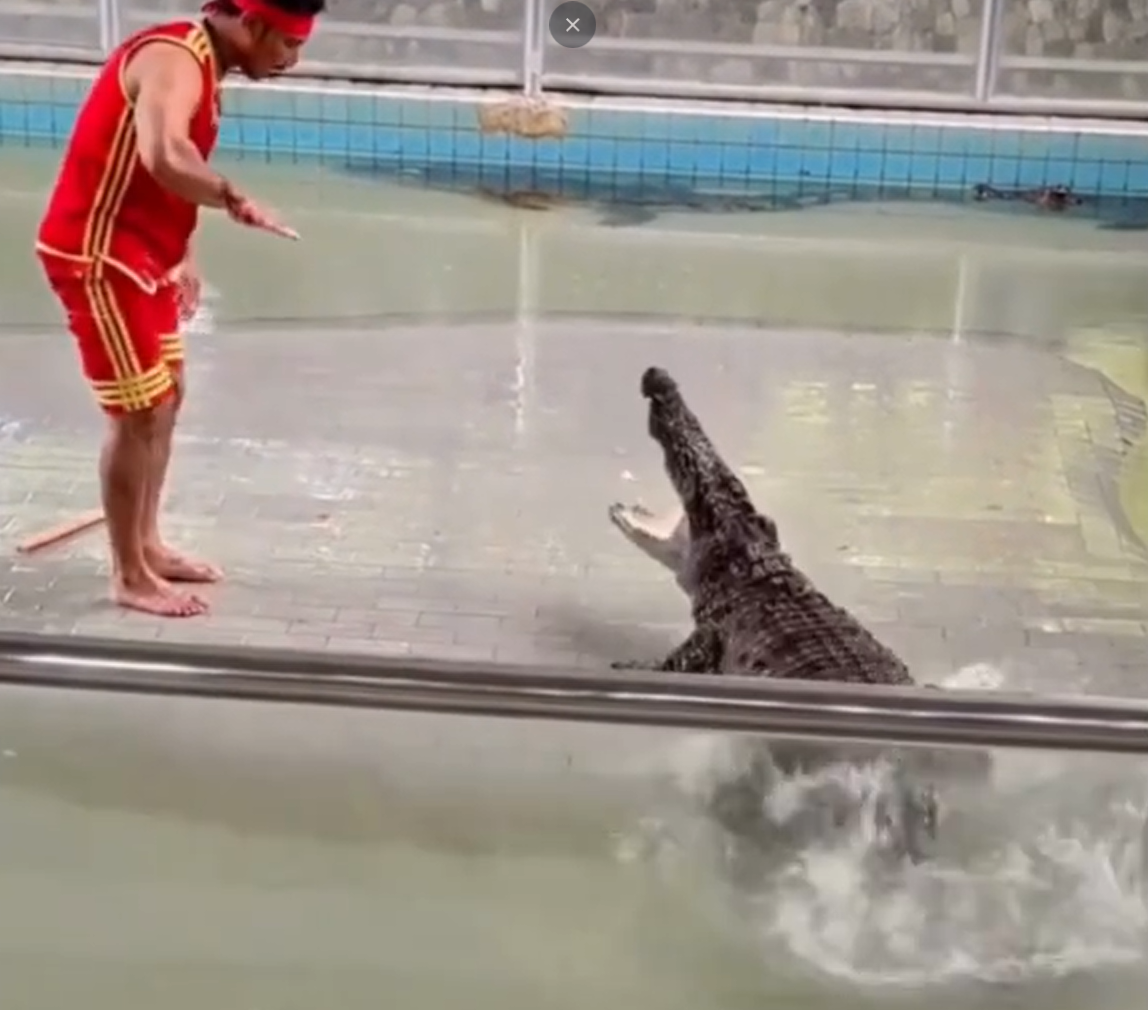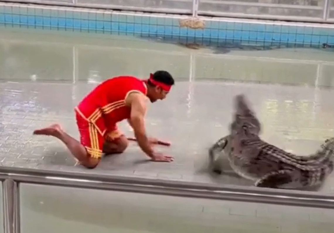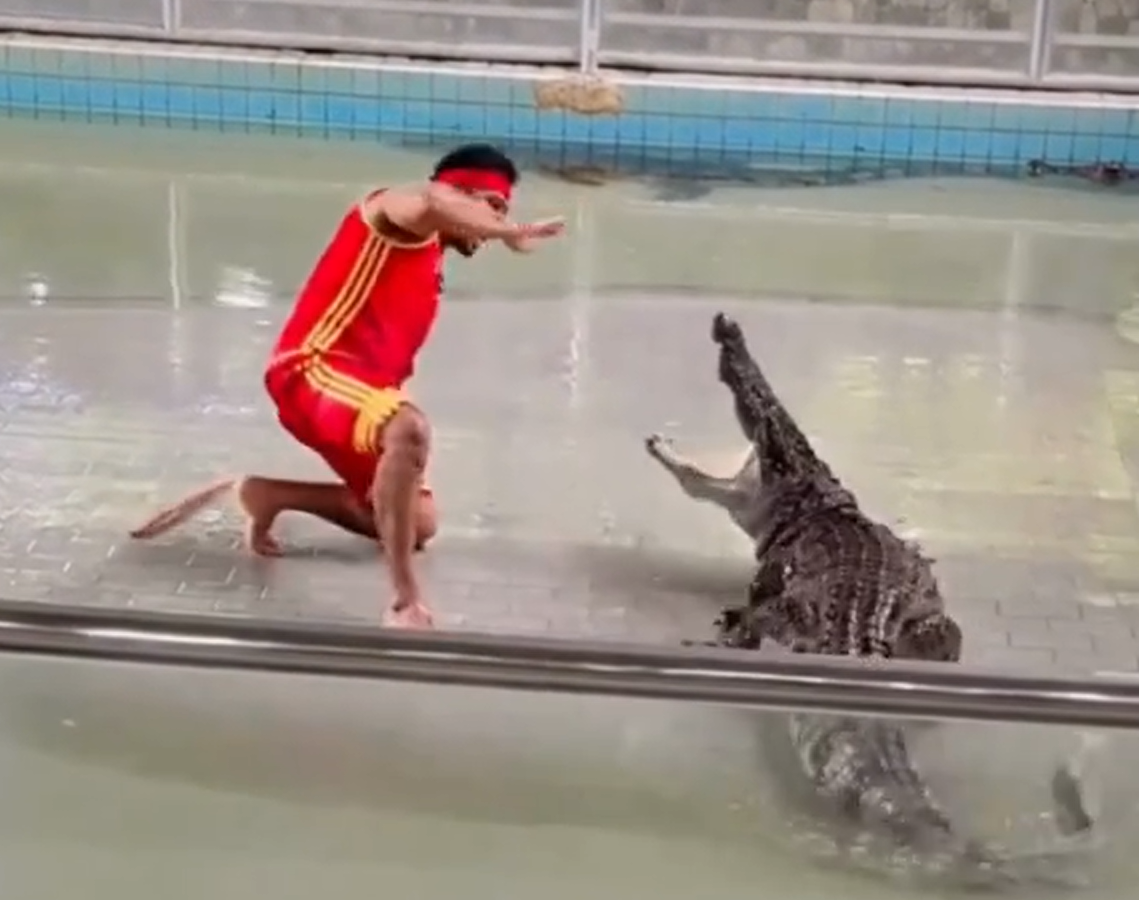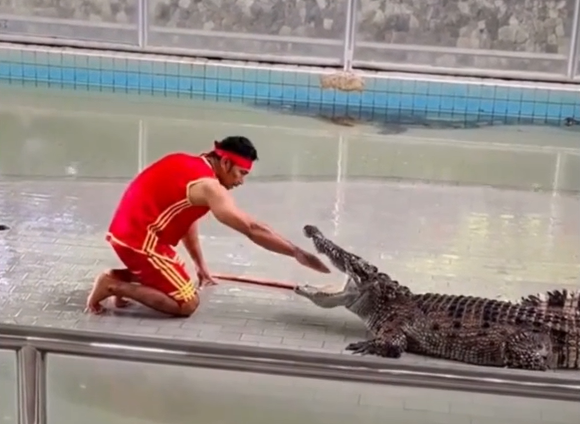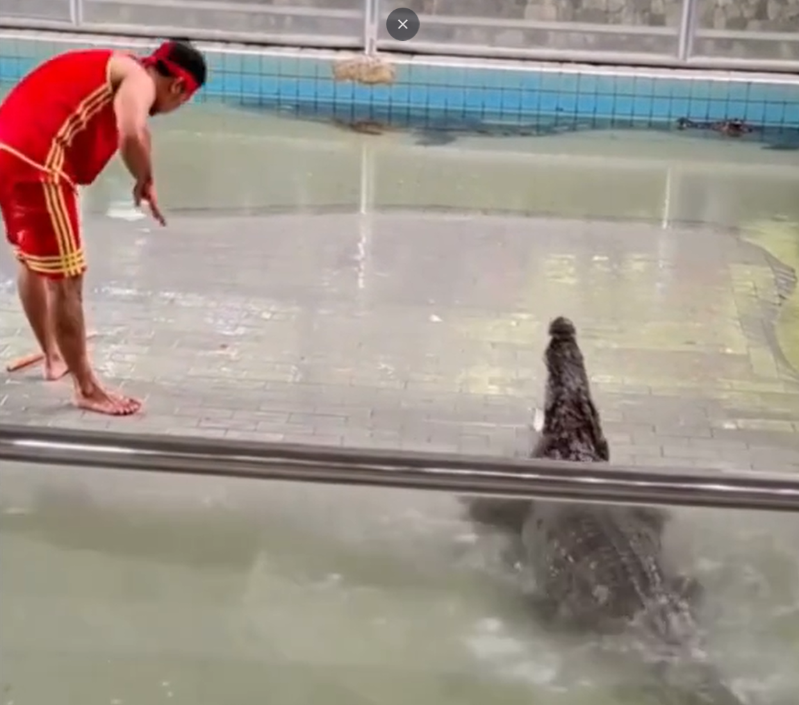 網上流傳片段可見,一名馴鱷師當時正在上演表演的「指定動作」,用手拍拍鱷魚的鼻子後,再把手伸進鱷魚正在張開的嘴巴裡。