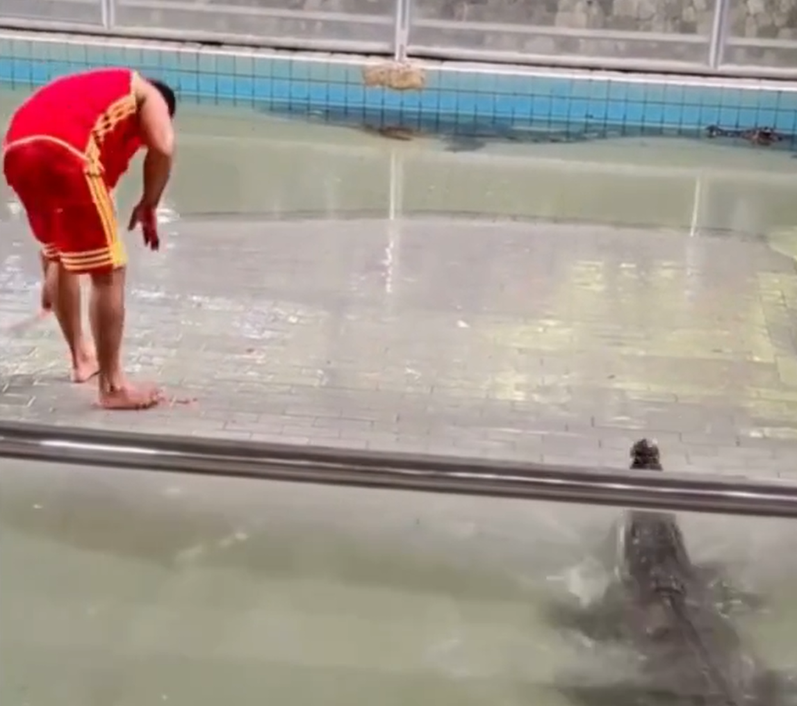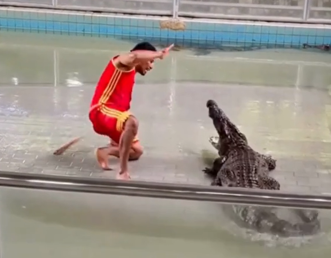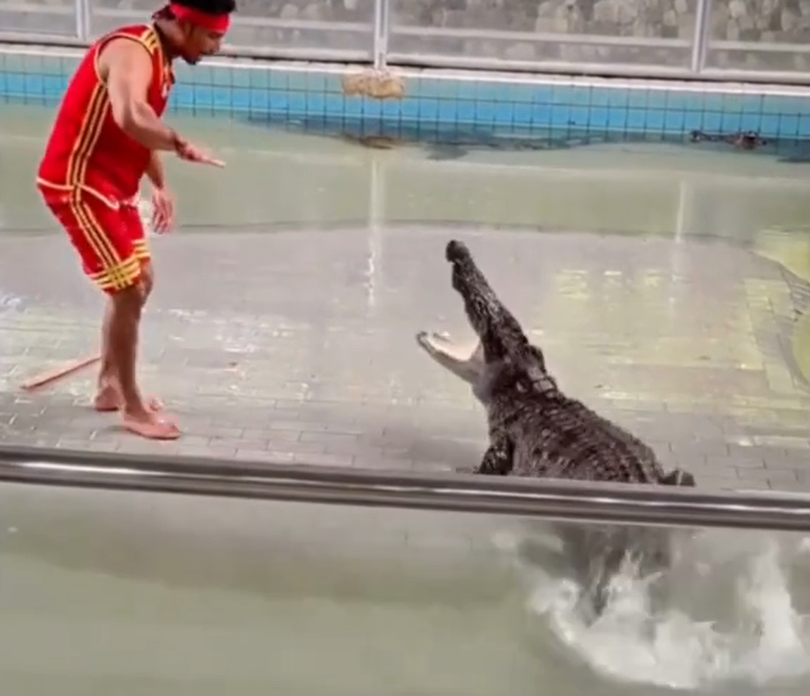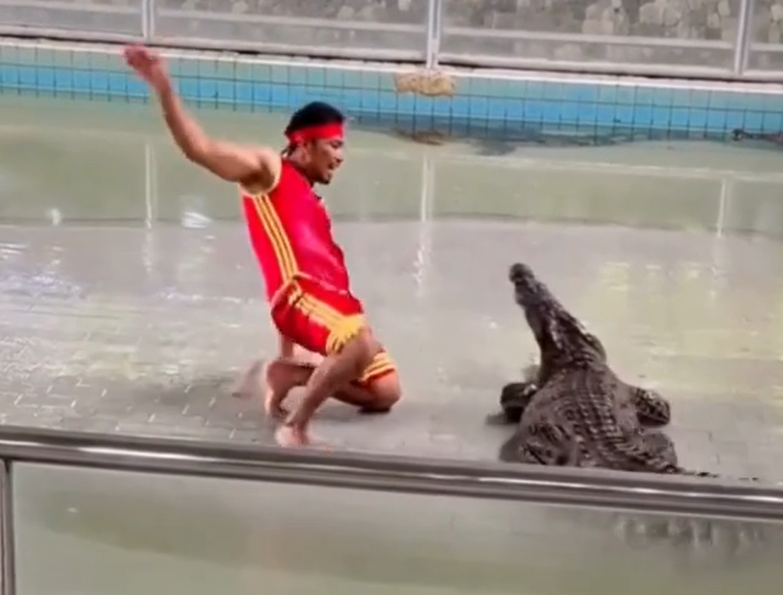 網上流傳片段可見,一名馴鱷師當時正在上演表演的「指定動作」,用手拍拍鱷魚的鼻子後,再把手伸進鱷魚正在張開的嘴巴裡。