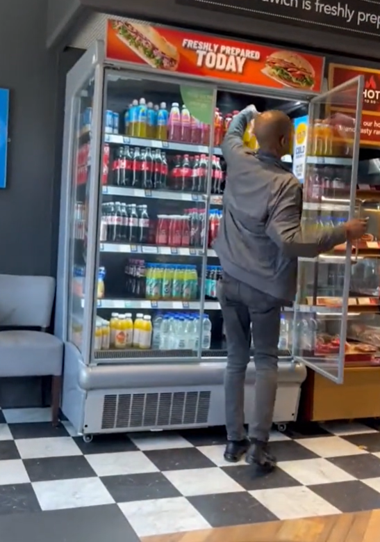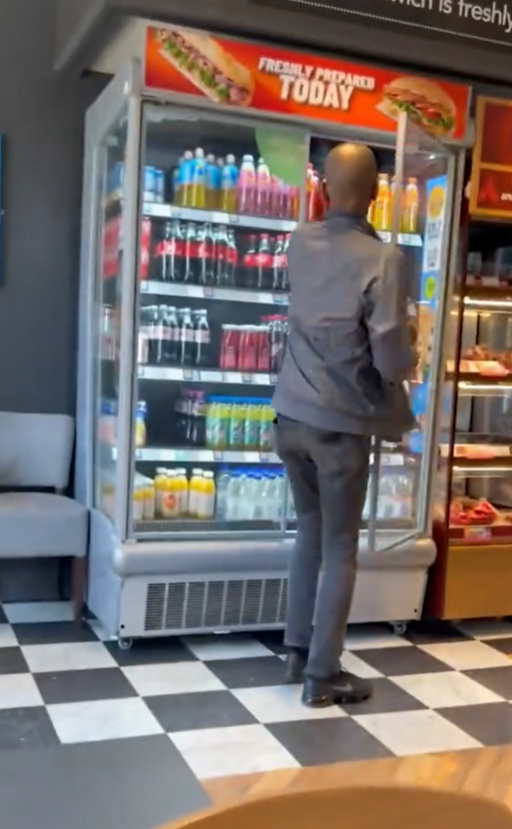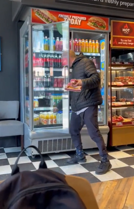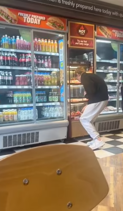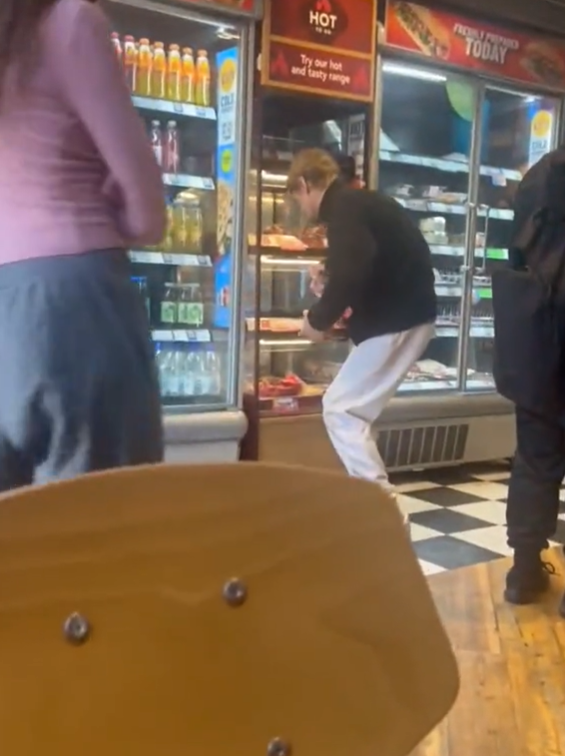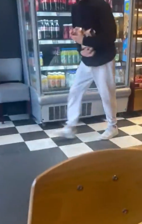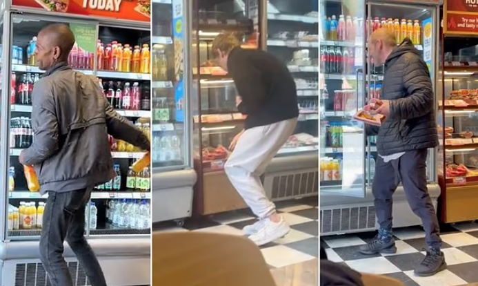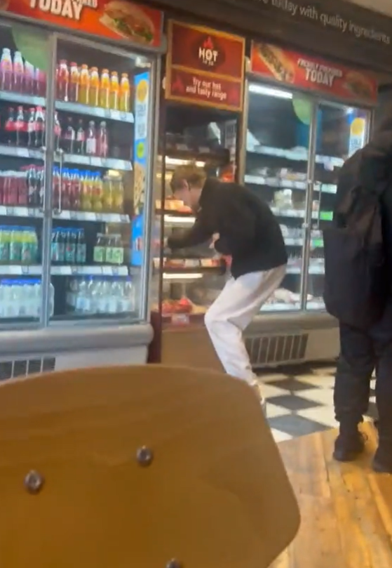 第一名男子進店後,取走3份熱食及兩杯飲品。一名女員工攔住他,並叫他「立即離開」,但賊人毫不畏懼,跟店員說「我不會『立即』離開,但我會很快離開」,臨走時還說「謝了,親愛的」。之後有一名穿著黑色羽絨外套和深色長褲的男子,拿走一堆熱食,他四處張望一會後,施然離開。接著是另一名男子,進店後取走兩瓶飲品。