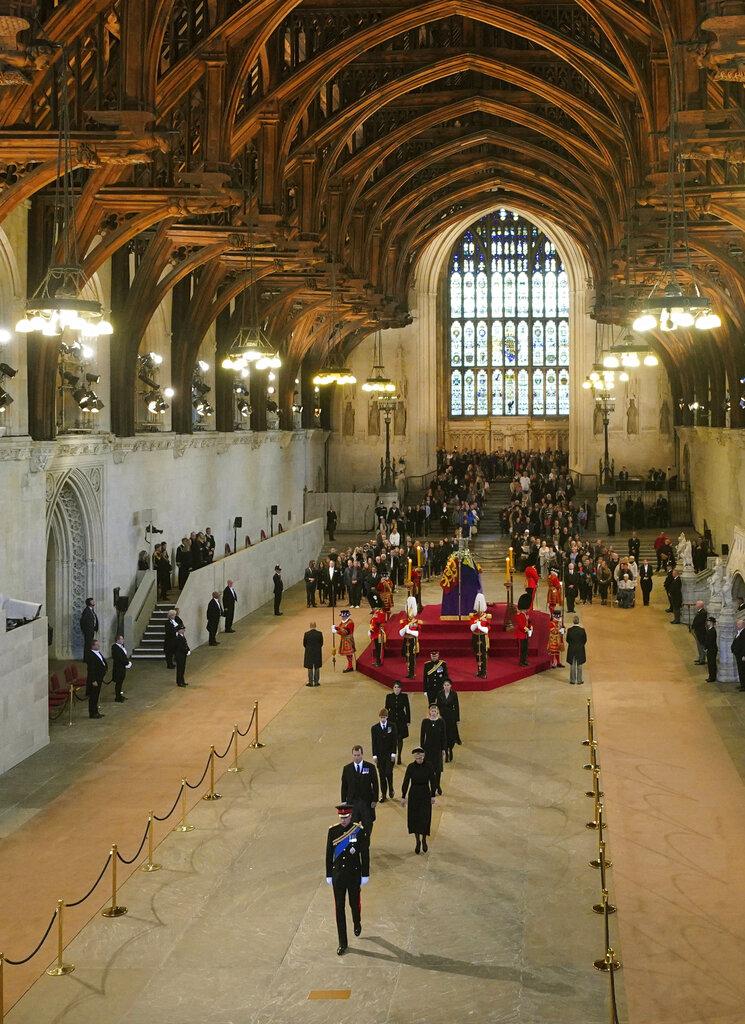 身穿軍服的王儲威廉及亨利王子率領女王另外6個孫兒女,步入西敏廳為女王守夜,是英國首次有君王孫兒參與儀式。威廉及亨利分別站在靈柩前後兩端,各人低頭默哀約15分鐘。