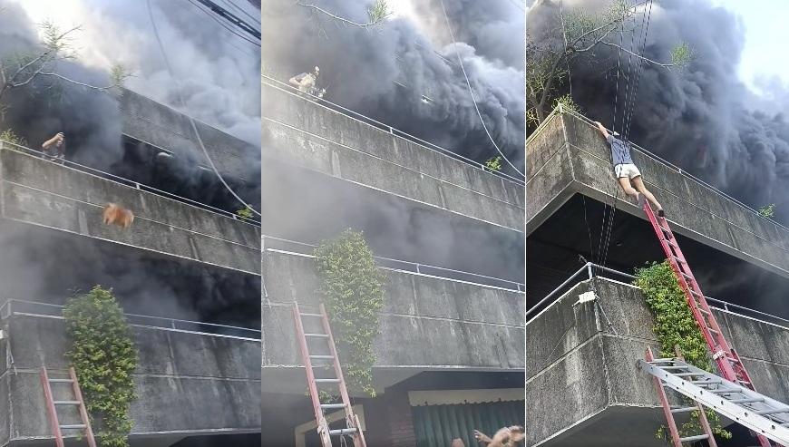 Facebook帳戶Ivy Baya周三(10日)上傳一段2分36秒影片,可見一名女子被困在大廈3樓,背後濃煙竄出,在場救援的民眾催促她快逃,但她先將一隻狗狗從露台拋下,在下方救援人員及街坊伸手接住,瞬間又拋下另一隻狗狗,現場的人見如此驚險,尖叫聲連連。有人舉起梯子讓女子爬下,但梯子太短,未能接觸女子。