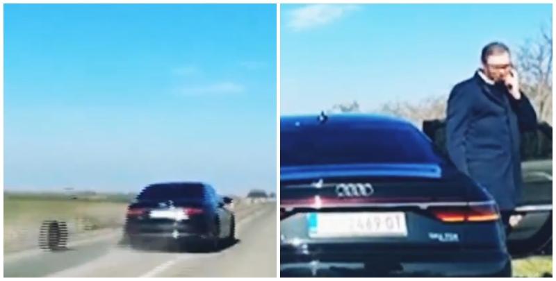 塞爾維亞總統武契奇乘坐的座駕上周六(8日)於北部地區一公路行駛途中發生意外,輪胎發生脫落,後方車隊的車Cam直擊其座駕一度失控,左搖右擺後急煞停,幸事件未造成傷亡,武契奇及隨行人員下車檢查狀況。(影片截圖)