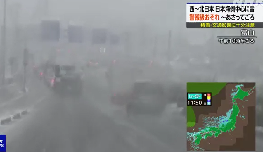在「10年一遇」最強寒流吹襲下,日本海沿岸廣泛地區均降雪,截至周四下午2時的過去24小時,北海道苫前町降下31厘米雪量,岐阜縣白川鄉和廣島縣北部更分別降下42厘米雪量,廣島市也錄得41厘米雪量;青森縣青森市和新潟縣阿賀町分別降12厘米和20厘米雪量,九州北部福岡等也有降雪,大阪則首降雪。氣象廳預測北陸地區至周五早上6時的24小時降雪量將達80厘米、東海地區60厘米,北海道、關西和中國地區均降雪50厘米。報道指,北海道宗谷地地區因降雪學校須停課,JR宗谷線也有列車停駛,而JR東海公司也宣布,周四至周五可能將有部分路線列車停駛或出現延遲狀況。