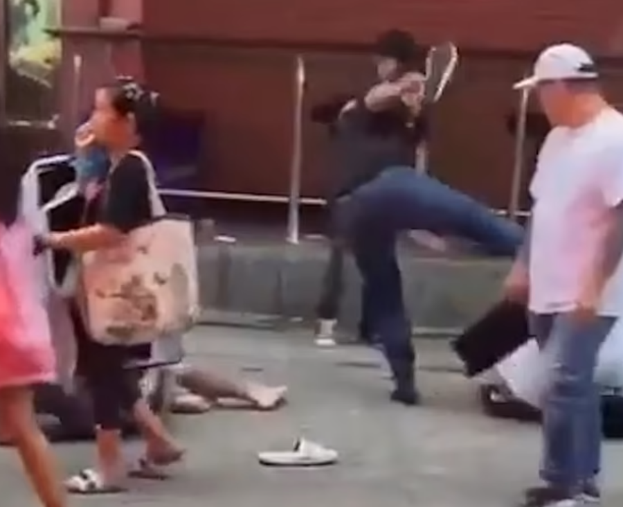 經過幾分鐘推撞後,保安突然發狂,毆打兩名分別穿灰衫及白衫的遊客,將他們拖到街上、推倒在地。片段可見,其中一名保安朝著白衫遊客的腿和胸部踢踹;另一名保鏢則更暴力,衝前猛踢遊客頭部。被踢頭的遊客之後躺在地上動也不動。片段亦可見其中一名保鑣鼻子受傷流血。