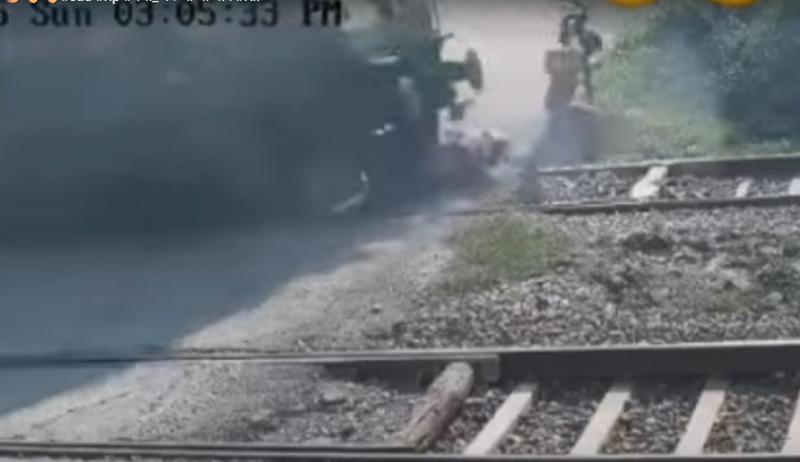 鐵騎士闖鐵路跌車,跟火車鬥快不及逃生慘被撞死。(YouTube)