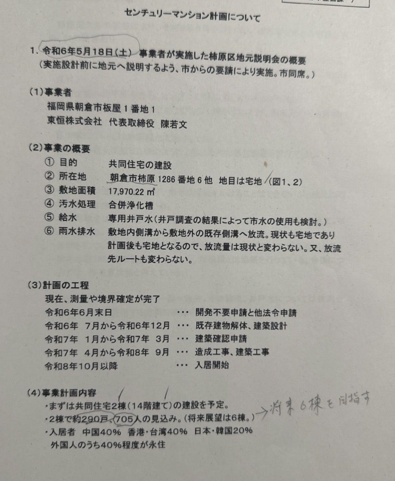 日本媒體報道,在去年5月,福岡縣朝倉市柿原地區一間企業向地方居民舉行簡介會,表示會在鄰近高爾夫球場旁的1.8萬平方米土地上,興建兩棟14層高的住宅大廈,並計劃將來興建至6楝住宅。而當中的住戶,將有40%是中國內地、40%是香港及台灣地區,餘下20%是日本及韓國人。根據福岡縣的規定,超過3,000平方米的土地開發,需要獲得縣知事的許可,因此網上傳言知事已經批准有關計劃,縣政府因此在今日公布,表示有關開發未獲得許可。