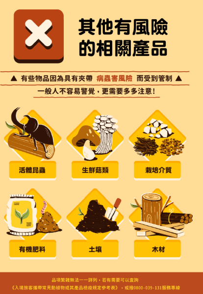 有發芽能力的植物產品,亦不可入境,如蔥、薑、蒜、未研磨的香料種子;豆類種子如黃豆;其他種子如藜麥、奇亞子、亞麻子。其他有風險產品如活體昆蟲、生鮮菇類、有機肥料、土壤、木材及栽培介質等,亦不得入境;而白米、乾燥香菇、茶葉、熟花生、乾金針菇、熟大蒜等食品,各不得攜帶超過1公斤、總和不得超過6公斤。罐頭方面,有關當局強調,民眾「若搞不清楚是甚麼罐頭,請不要攜帶」。因禁帶產品不能盡錄,如有疑問可打當地專線0800-039-131查詢。