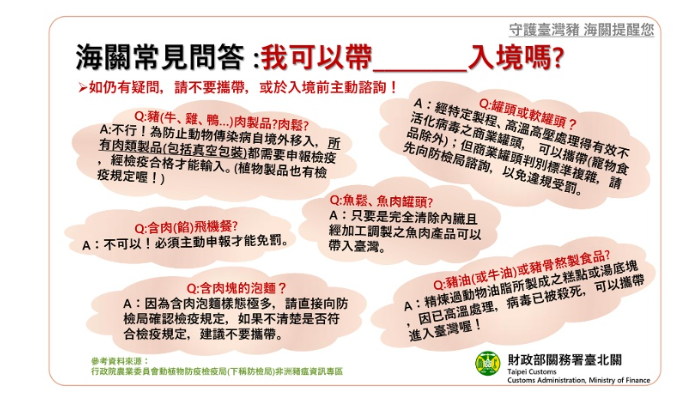 .被列為禁止輸入的須檢疫動物及動物產品(例如來自近3年發生非洲豬瘟國家之豬肉及豬肉製品等)。